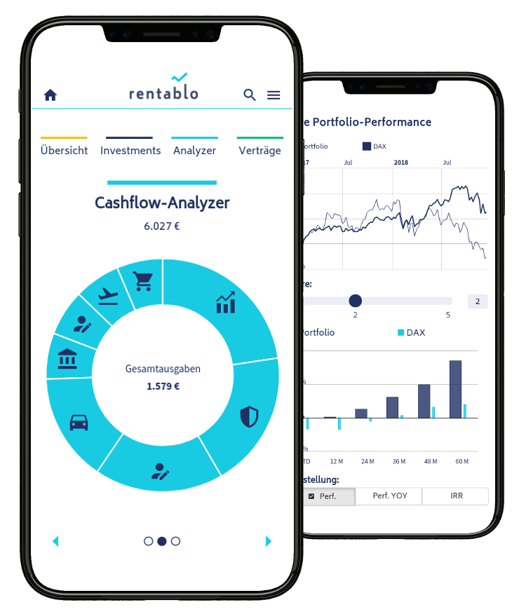 Planen Sie Ihre persönlichen Finanzen anhand von Kriterien wie Ihrer Portfolio Performance, Ihrer regelmäßigen Einnahmen und Ausgaben oder auch Ihrer Dividendenerträge. Rentablo unterstützt Sie hierbei mit Werkzeugen wie dem Cashflow-Analyzer, unserer Portfolio-Performance Analyse und dem Dividendenplaner.